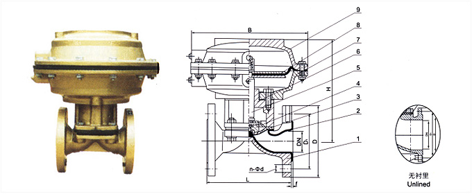 部件列表:1.閥體 2.閥體襯里 3.隔膜 4.閥瓣 5.下閥桿 6.閥蓋 7.氣缸 8.氣動薄膜 9. 氣缸蓋