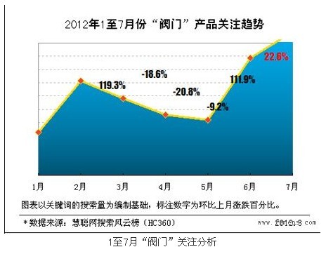 通過圖表,我們可以看出,對(duì)于閥門的需求,出現(xiàn)三個(gè)增長(zhǎng)點(diǎn),分別是2月份、6月份及7月份,近期觀察,6月份搜索關(guān)注增長(zhǎng)比例最高,達(dá)到111.9%,究其原因,我們通過調(diào)查分析,歸結(jié)為建筑維修、裝修等項(xiàng)目對(duì)于閥門需求增大。6月份是各大小區(qū)進(jìn)行加固及增加保溫層的季節(jié),也是家居裝修旺季,除此之外,各大工程項(xiàng)目開閘,這些都加大了對(duì)于閥門的強(qiáng)勁需求。